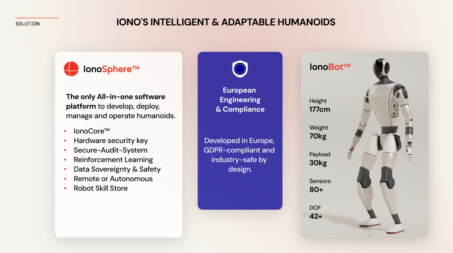 - IONO entwickelt humanoide Roboter für die Industrie sowie die KI-Plattform, die ihre autonome Interaktion ermöglicht, inklusive Wahrnehmung, Greifen, Navigation, Prozessanpassung und Simulation. Hardware, Software und KI aus Europa, optimiert für reale Industrieprozesse und das Co-Development neuer KI-basierter Anwendungsfälle mit Partnern.